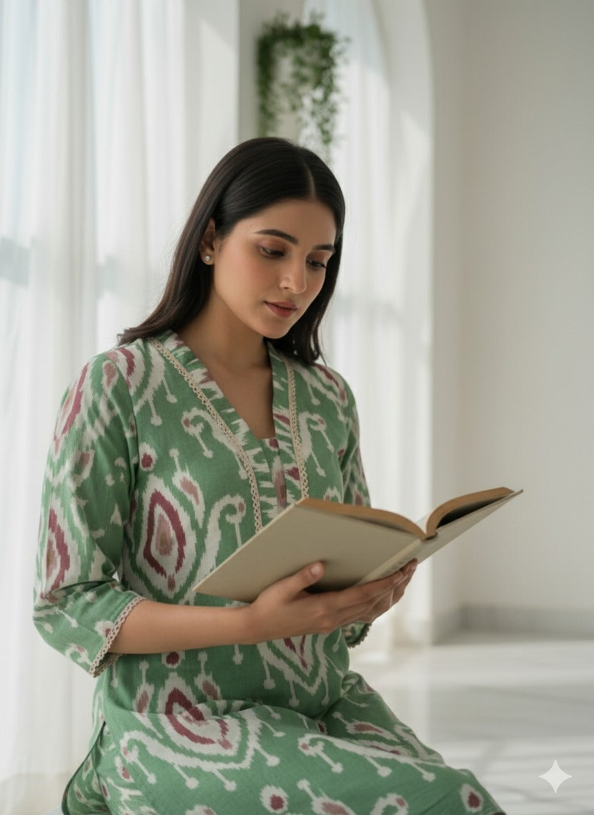 ✨ Color: Fresh green base with traditional Ikat-inspired print in maroon and white.