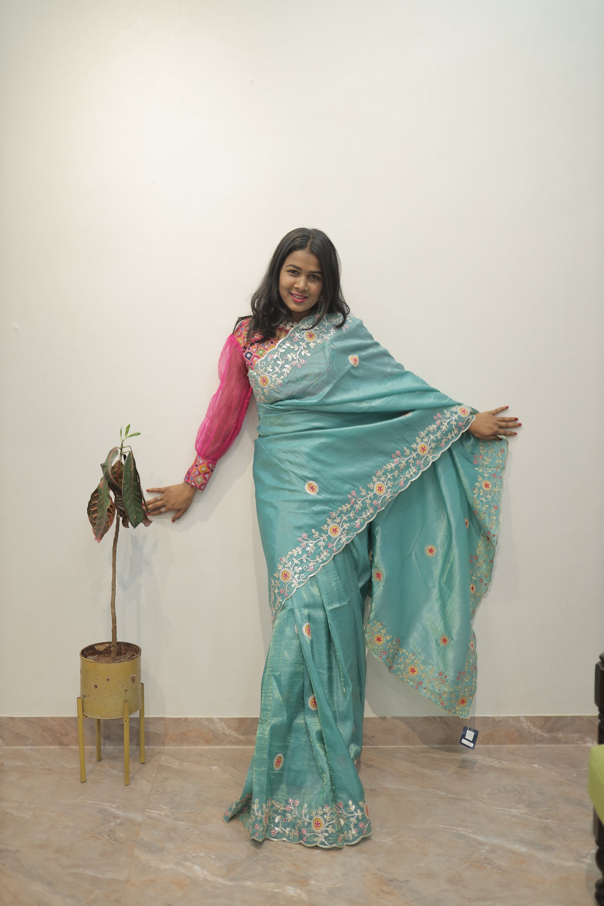 • Pallu: Rich embroidered pallu – graceful fall